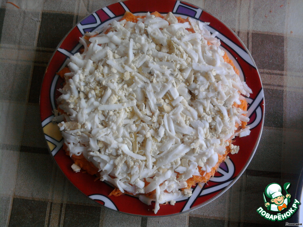 Сверху трем на крупной терке вареные яйца. Промазываем майонезом.