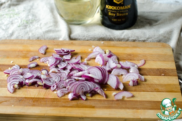 Теперь переходим к приготовлению заправки. В миску влить растительное масло, соевый соус и с салатный соус Kikoman с луком, хорошо перемешать.