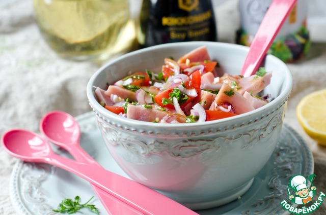 В салатники положить ветчину, лук, помидоры черри и петрушку. Добавить заправку и подавать к столу.