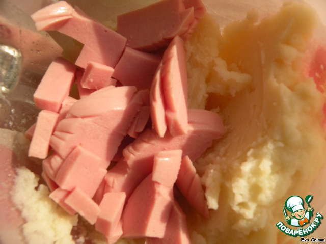 Отварить картофель, замешать пюре с добавлением яйца и молока… Добавляем мелко нарезанную колбаску