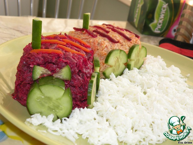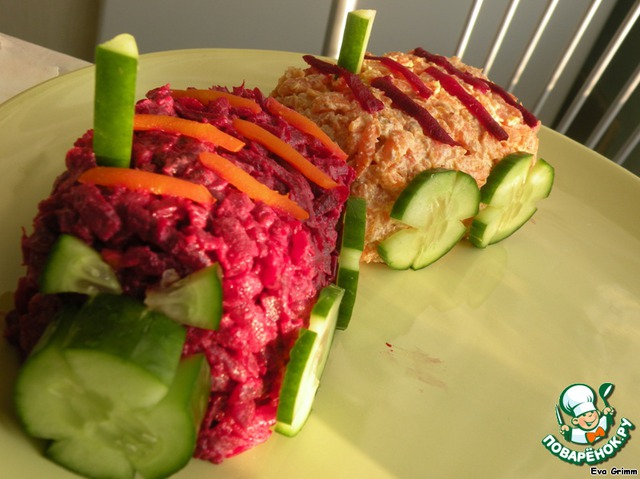 Сделать две массы с добавлением столовой ложки сметаны (на каждую массу) соли и ореха… Облепить массами вагончики, добавив овощные «тигриные полосочки»…