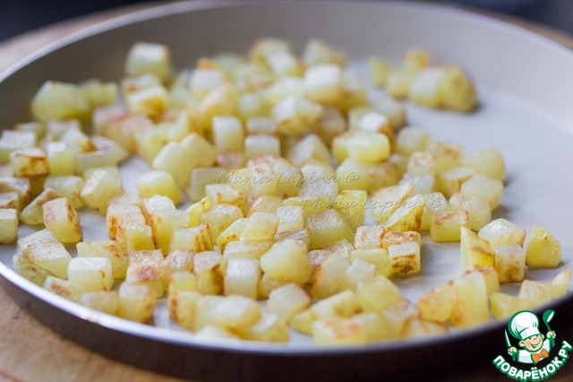 Картофель почистить и нарезать на небольшие кубики. На оливковом масле пожарить картофель с золотистой корочкой до готовности. Посолить в конце.