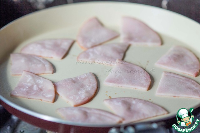 Ветчину нарезать на треугольники и обжарить на сковороде.
