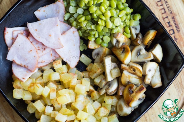 | Перед балом Золушке необходимо подкрепится сытным, но в тоже время легким и элегантным блюдом. Теплый салат из картофеля с ветчиной, горошком и грибами как нельзя кстати подойдет. Зеленый горошек от фирмы Мистраль идеально подходит для таких салатов, он очень нежный на вкус и прекрасно держит форму, если его не разваривать. Яйцо-пашот выступает в качестве заправки и делает блюдо более нежным и изысканным. Салат готовиться из простых ингредиентов, которые наверняка найдутся на кухне у золушки. |