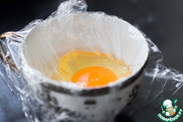 Приготовим яйцо пашот. В чашку положить пищевую пленку, смазать растительным маслом и разбить в неё яйцо. Поднять края и завязать их. Старайтесь, чтобы в пленке было меньше воздуха.
