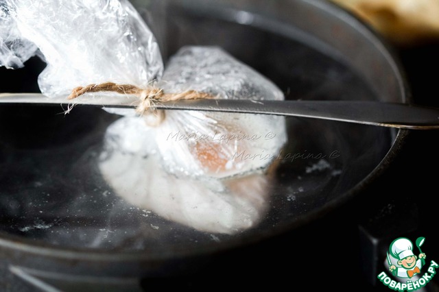 Привязать к палочке для суши или длинной ложке. Я использую бытовую веревку, можно взять просто нитку. Опускаем в кастюлю с кипящей (но не сильно булькающей) водой так, чтобы яйцо не касалось дна. Варим минуты 3 -4. Аккуратно достаем готовое яйцо из пленки.