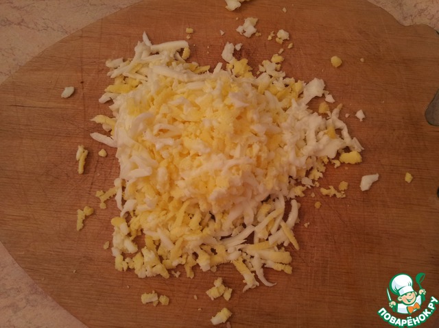 Отвариваем яйца вкрутую и натираем на крупной терке.