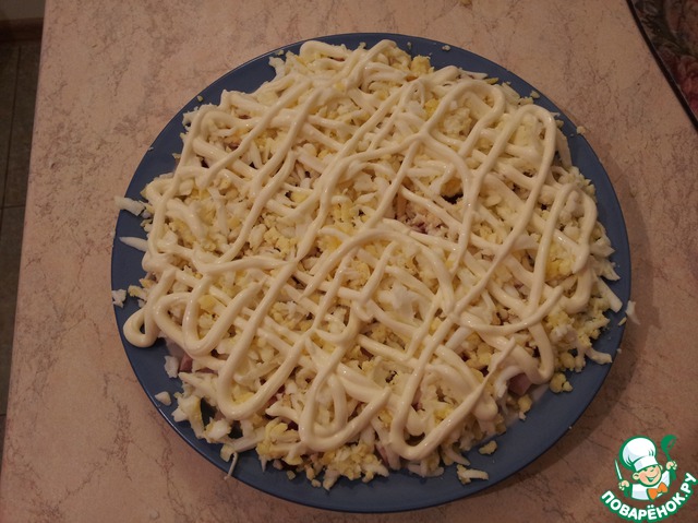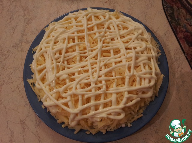 Сыр натираем на крупной терке, выкладываем его поверх яиц, покрываем сеточкой из майонеза.