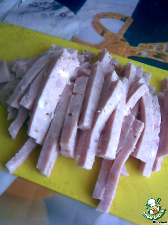 Колбасу нарезать брусочками.