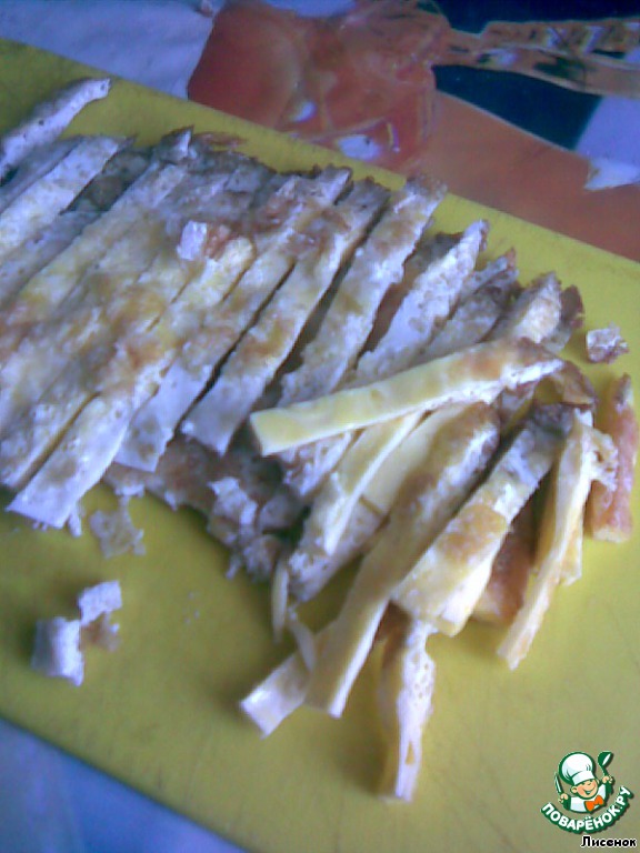 Остывший омлет порезать пополам и каждую половинку на полоски.