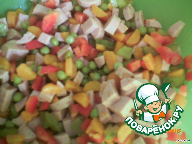| Это салат с макаронами, морковью, болгарским перцем, маринованными огурцами, зеленым горошком и сосисками. |