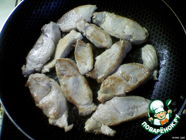 Остуженную индейку порезать соломкой.