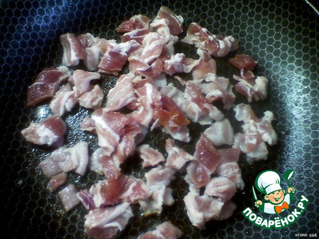 Бекон нарезать на средние кусочки и обжарить без масла на сковороде буквально 3 минуты.