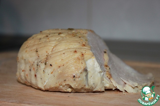 Берем филе индейки - у меня это уже готовая запеченая в специях грудка, вы можете взять отварную или же запечь по своему рецепту. Нарезаем ее тонкими ломтиками под углом против волокон.