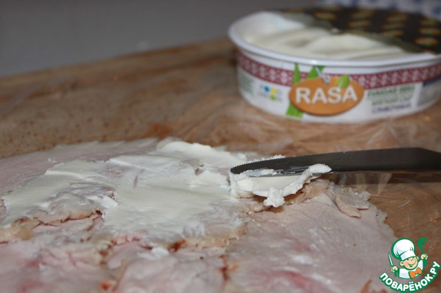 Выкладываем кусочки мяса на пищевую пленку и смазываем их сливочным сыром.