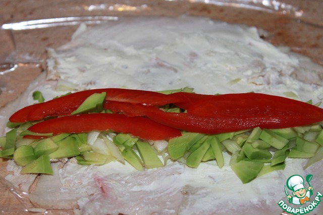 Режем авокадо, перец и выкладываем на нашу конструкцию