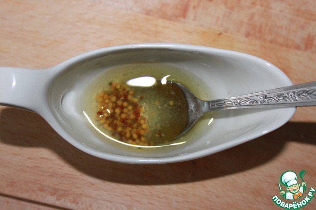 Сворачиваем наш ролл и отправляем ненадолго в холодильник. а за это время готовим заправку из масла, горчицы, соли и перца.