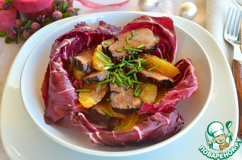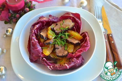 | Аромат запеченой утки – это запах праздника. В сочетании со сладкими апельсинами, чуть горьковатым красным радиккио и соево-кунжутной заправкой – это по-настоящему празднечный, деликатесный салат. Если вы не любите горькие салатные листья, замените радиккио другим салатом. |