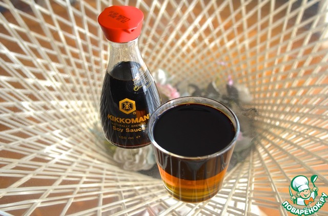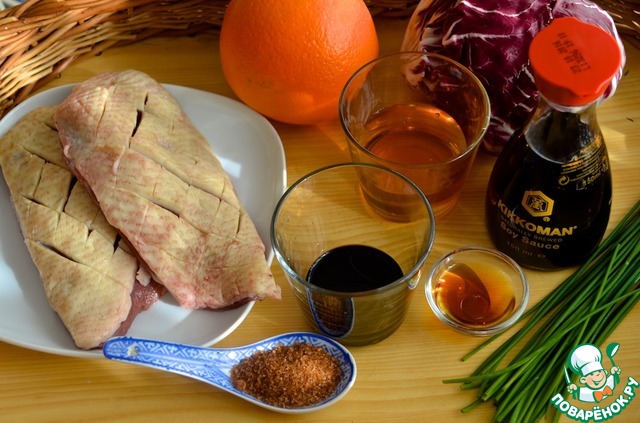 6. Для заправки смешать соевый соус, уксус, сахар и кунжутное масло. Разложить листы салата по тарелкам, сверху выложить утку и дольки апельсина. Полить заправкой. Сверху «постричь» стрелы шнитт-лука (не очень мелко, крупные стрелочки в данном салате смотрятся красивее).