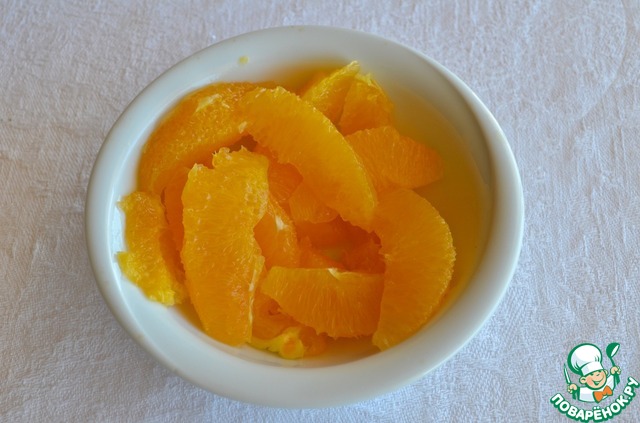 4. С апельсинов снять кожуру и белую пленку и разделить на сегменты.