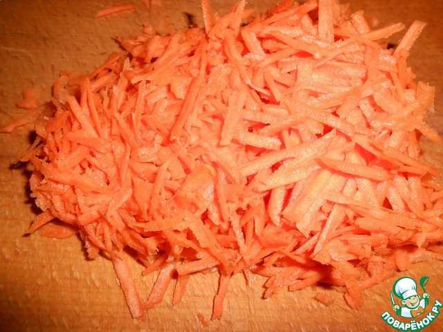 Затем жарим лук. Когда он будет почти готов, добавляем к нему морковку. Лук должен быть золотистого цвета, а морковь мягкой, тогда овощи снимаем с огня и добавляем к печенке.