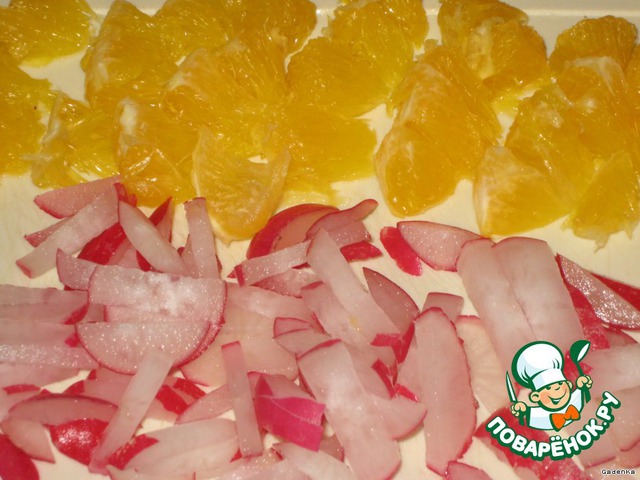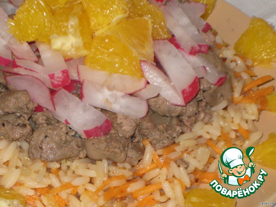 | Продолжение нашего девичьего стола. Салатик очень порадовал не только глаз, но и само сердце желудка))) Маринованный рис с сырой морковкой, очень пикантно и вкусно уже, дальше еще вкуснее, добавляем нежную куриную печень, для хрустящей свежести добавим редиску, украсим все апельсинами для кисло-сладкой нотки, в итоге получим массу положительных эмоций. А если еще и компания подходящая, то можно наслаждаться и тем и другим бесконечно, не забыв конечно про бутылочку (другую) хорошего винца. |
