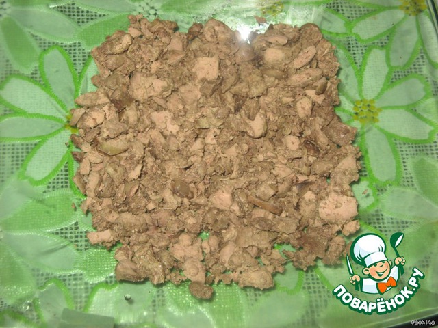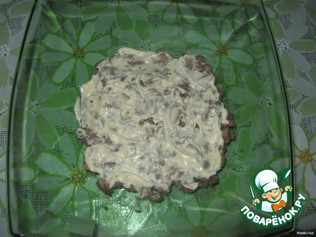 Печень мелко нарезать. Выкладываем в салатник первым слоем.