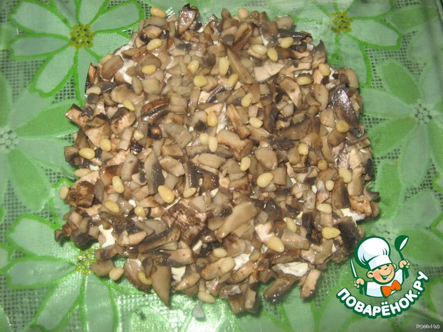Шампиньоны нарезать и обжарить. Остудить и выложить вторым слоем, посыпать орешками.