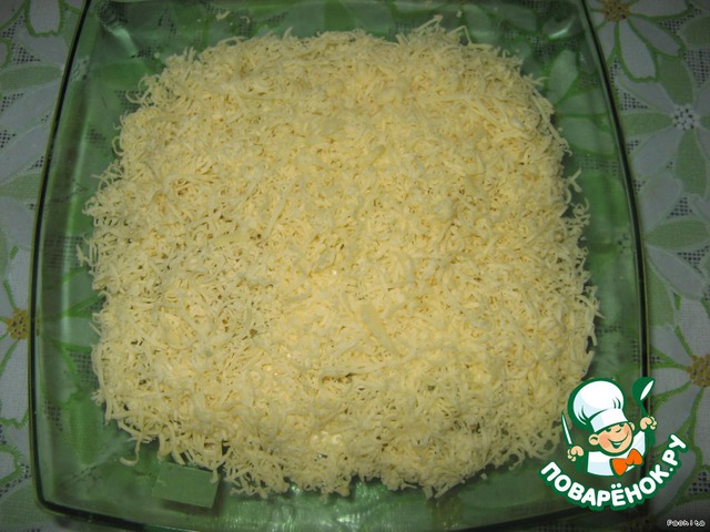 Сыр натереть на мелкой тёрке, посыпать сверху.
