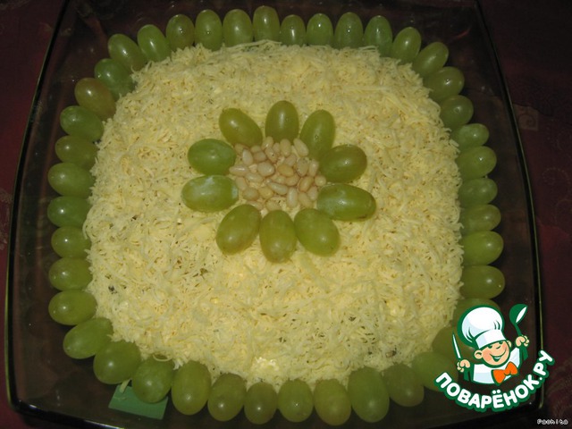 Виноград нарезать, выложить четвёртым слоем, посыпать орешками.