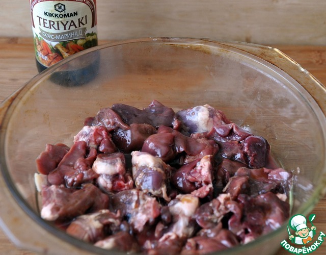 Берём куриную печень, режем на крупные куски, заливаем соусом-маринадом Teriyaki от "Киккоман".