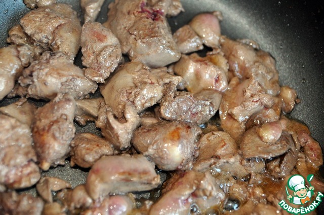 На горячую сковороду наливаем растительное масло. Я сначала кладу сердечки, обжариваю 2 минуты, они жарятся дольше, а потом уже кладу печень.