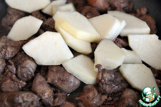 Берём спелую, сочную, твёрдую грушу, удаляем сердцевину, очищаем кожуру, режем пластинками и добавляем к печени.