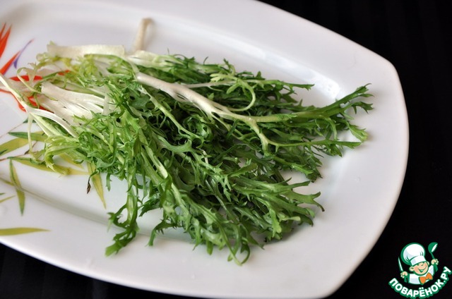 На блюдо кладём помытые и обсушенные листья салата, у меня фризе.