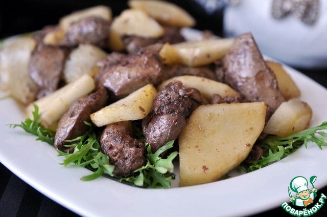 Перемешиваем печень с грушами, отключаем огонь, даём груше пару минут нагреться и пропитаться соками от печени, а заодно и отдать свой аромат.