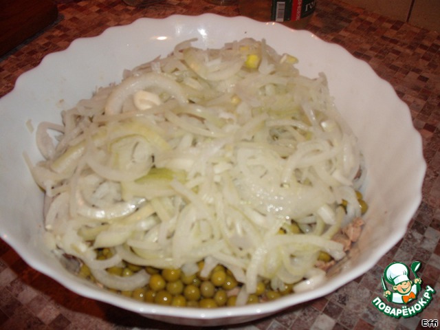 Теперь – очередь лука, предварительно слегка замаринованного.