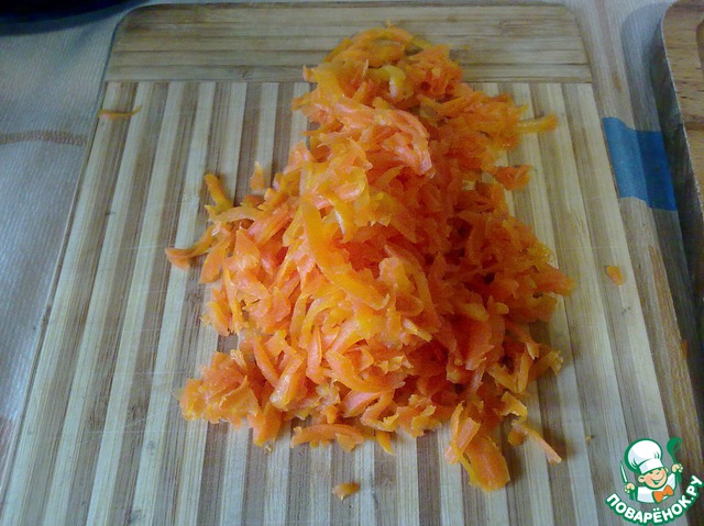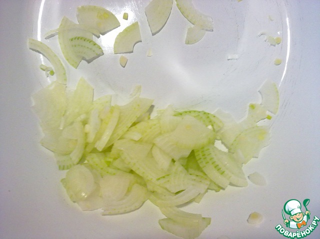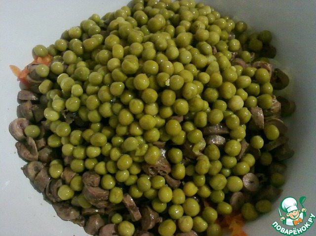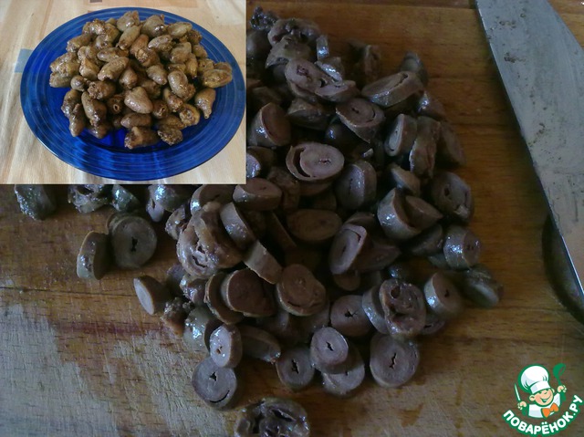 Сердечки обжариваем, остужаем и режем небольшими кусочками.