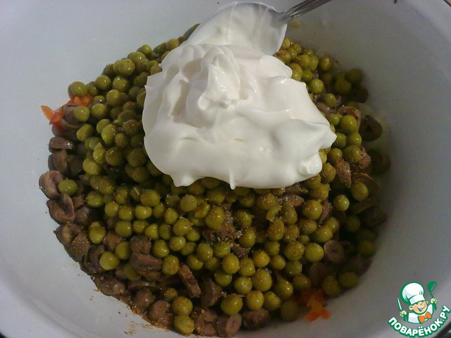 Все складываем в миску, солим, перчим, добавляем майонез. Все хорошо перемешиваем.