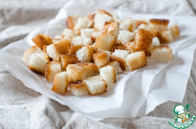 Обжарить его на растительном масле до румяности. Выложить крутоны на салфетку, чтобы впитался лишний жир.
