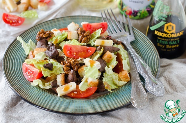 Помидоры черри нарезать на четвертинки, пекинскую капусту порвать руками на кусочки. На тарелки уложить печень, помидоры черри, сыр, кусочки пекинской капусты, посыпать крутонами и заправить салатным соусом Kikoman с луком.