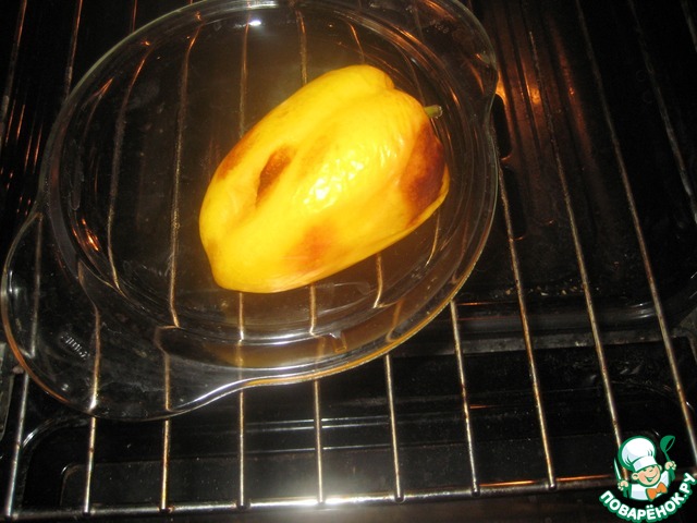 Перец положить в горячую духовку и запечь до коричневых бочков.