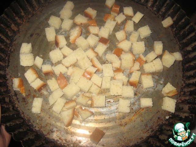 Белый хлеб нарезать кубиками и подсушить в той же духовке. По желанию-сухарики перед запеканием можно подсолить, посыпать сухими приправами и сбрызнуть маслом.