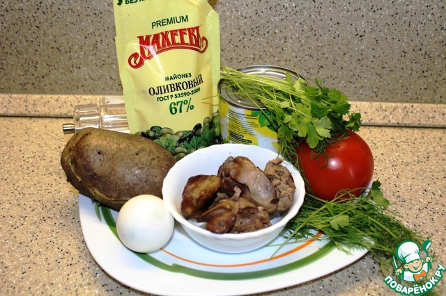 Продукты для приготовления салата. Картофель и яйцо сварены, печень промыта, зачищена от пленок и отварена в кипящей подсоленной воде (10-12 минут время варки).