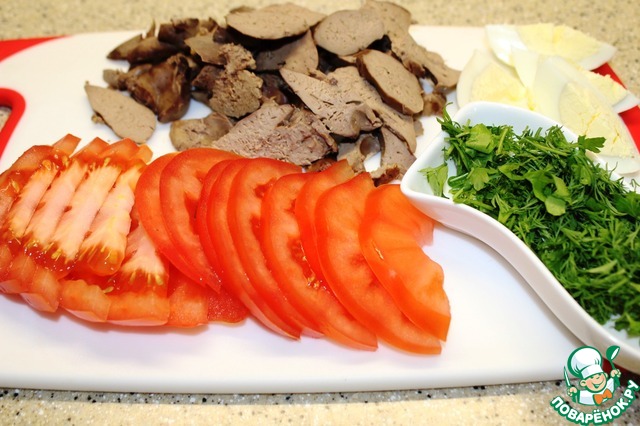 Помидор, печень нарежьте тонкими ломтиками. Вареное яйцо разрежьте на 4 части, зелень порубите.