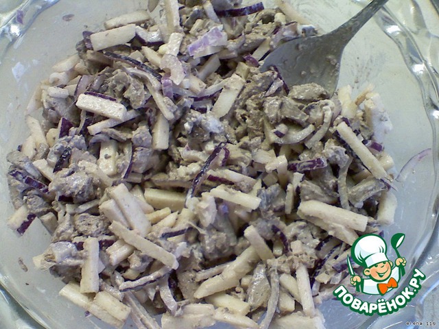 Смешать яблоко с луком и осторожно добавить к ним нарезанную соломкой тёплую печень.