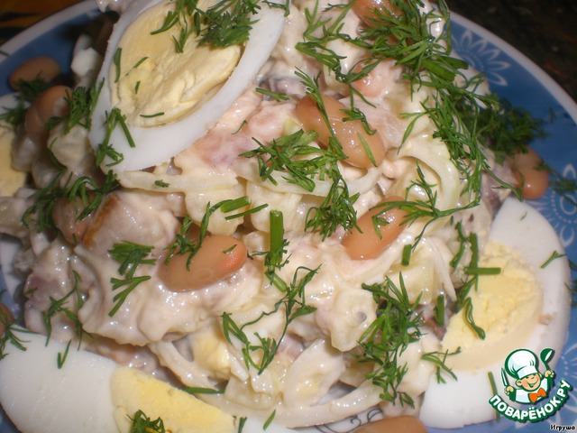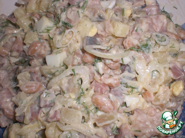 Всё соединяем, добавляем 3-4 ложки фасоли, не отделяя её от соуса, майонез и мелко нарезанный укропчик. Хорошенько перемешиваем.