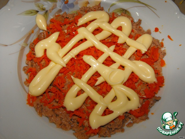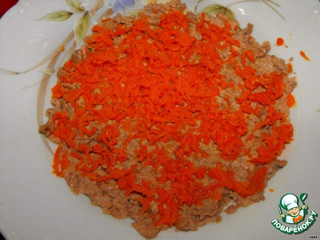 Морковь отварить до готовности, остудить, очистить, натереть на мелкой терке и уложить на печень трески.