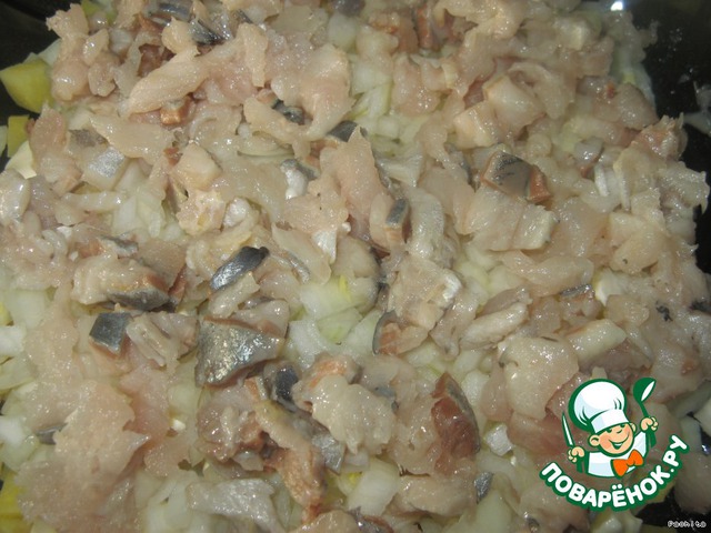 Картофель очистить, нарезать кубиками.Свеклу очистить, натереть.Морковку порубить, чтоб стала мельче.Сельдь нарезать небольшими кусочками.Грибы мелко нарезать.