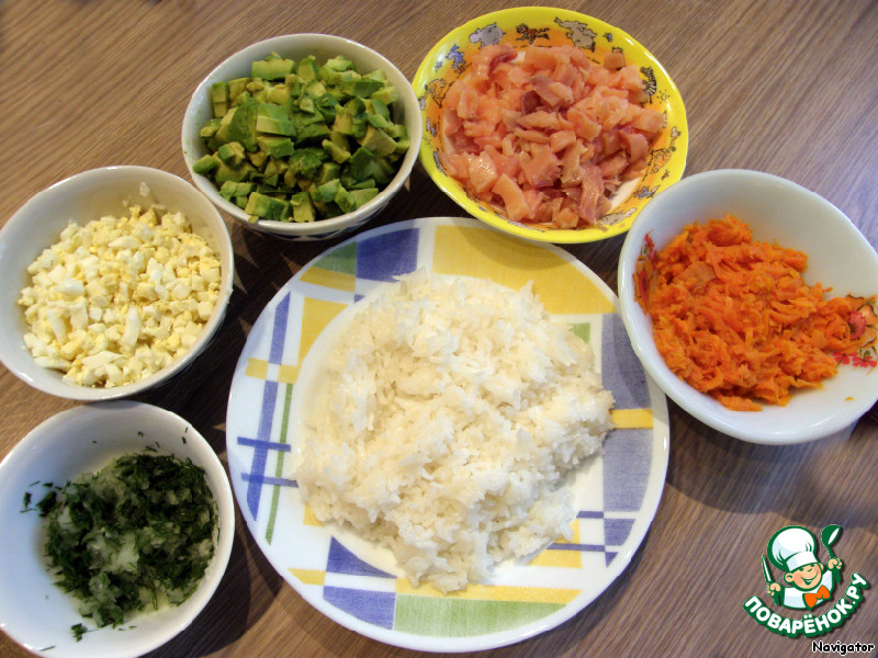 Авокадо и семгу нарежьте на небольшие кусочки. Вареную морковь натрите на терке или порежьте кубиками.