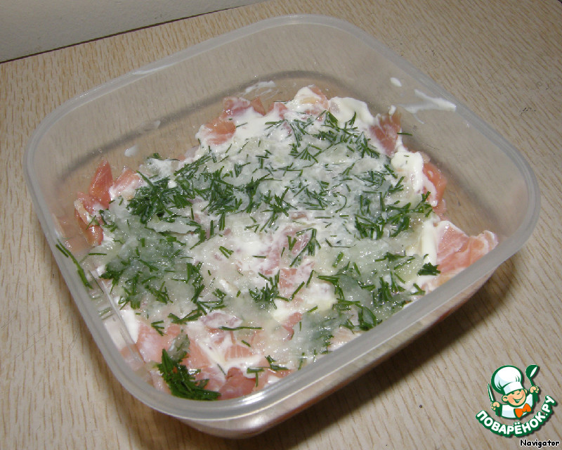Смажьте майонезом (или другой заправкой) и посыпьте укропом и зеленым и репчатым луком.